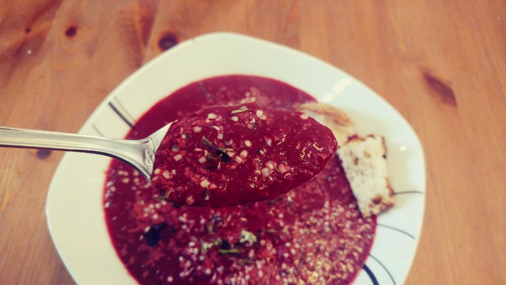 Nous avons souvent des betteraves dans notre panier de légumes et Niko n’aime pas ça. Après avoir fait plusieurs brownies à la betterave, j’ai voulu tester cette soupe. J’ai eu l’idée après en avoir mangé dans un café à Exeter. Je me suis dit que cela devait être simple à faire et c’est le cas. Je la fais très souvent le midi pour Avril et moi, nous adorons ça. J’ai donc décidé de partager cette recette si simple avec vous!